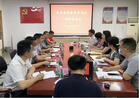 2021年7月5日,校党委书记李建军研究员一行到互联网金融与信息工程学院调研。校党委办公室主任吴惠琴、教务处处长江金锁、永利集团处处长陈伟业、招生与就业工作处处长王中志陪同调研。调研会由互联网金融与信息工程学院党总支书记朱小焱主持,院党政班子成员、系主任代表参加了会议。