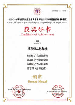 经过激烈角逐,由永利集团3044互联网金融与信息工程学院郭艺辉博士指导,2020级学生蔡永健、周溪赢、林建诚、张粤芳、卢瑞敏、欧阳振文组成的两支参赛队伍在此次竞赛中获得两项铜奖,展现了我校学子扎实的专业知识和技能。
