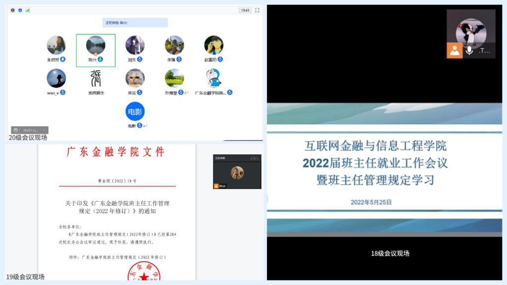 2022年5月25日,我院在腾讯会议平台分年级组织班主任专题学习学校新修订的《班主任工作管理规定》,校本部各年级辅导员、班主任参加了本次学习会,会议分别由各年级级长冯晓骏老师、钟培权老师、陈兴老师主持。