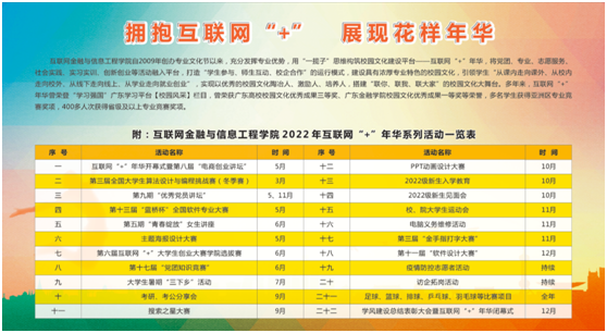 据悉,互联网金融与信息工程学院自2009年创办专业文化节以来,充分发挥专业优势,用“一揽子”思维构筑校园文化建设平台——互联网“+”年华,将党团、专业、志愿服务、社会实践、实习实训、创新创业等活动融入平台,建设具有浓厚专业特色的校园文化,打造“学生参与、师生互动、校企合作”的运行模式,引领学生“从课内走向课外、从校内走向校外、从线下走向线上、从学业走向就业创业”,营造“联你、联我、联大家”的良好氛围,以优秀的校园文化陶冶人、激励人、培养人。多年来,互联网“+”年华曾荣登“学习强国”广东学习平台【校园风采】栏目,曾荣获广东高校校园文化优秀成果三等奖、永利集团3044校园文化优秀成果一等奖等荣誉。