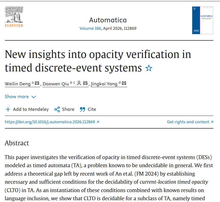 上述成果从赋时系统与参数化系统两个维度拓展了不透明性理论的研究边界,体现了我院在离散事件系统安全分析与形式化方法领域的持续创新能力。未来,我院将继续围绕复杂系统信息安全中的关键科学问题,深化基础理论研究,推动相关成果在网络安全与信息物理系统等领域的应用与落地。