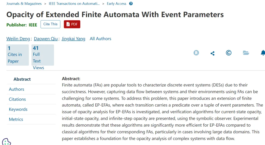 与此同时,在IEEE Transactions on Automatic Control上发表的论文“Opacity of Extended Finite Automata With Event Parameters”,针对传统有限自动机难以高效刻画数据流与控制流耦合的问题,提出了一类新的模型——带事件参数的扩展有限自动机(EP-EFA)。该模型通过在事件中引入参数及其谓词约束,显著增强了对复杂数据交互行为的表达能力。在此基础上,论文系统研究了EP-EFA框架下的不透明性问题,涵盖当前状态不透明性、初始状态不透明性以及无限步不透明性,并基于符号观察器构造提出了一套统一的验证算法。实验结果表明,与传统有限自动机方法相比,所提出算法在大规模数据域场景中具有显著的效率优势。该研究为融合“控制流—数据流”的复杂系统信息安全分析提供了重要理论基础与方法支撑。