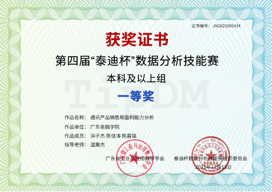 近日,第四届“泰迪杯”数据分析技能赛(全国赛)在线上顺利举行,共吸引了全国包括南京大学、中山大学、国防科技大学、华南理工大学、暨南大学、华南师范大学、中国地质大学、永利集团3044等学校共1500多支参赛队伍、4000多名选手同台竞技。经过激烈角逐,由我校互联网金融与信息工程学院温展杰老师指导,2019级学生洪子杰、陈佳涛、陈嘉铭组成的队伍获一等奖。