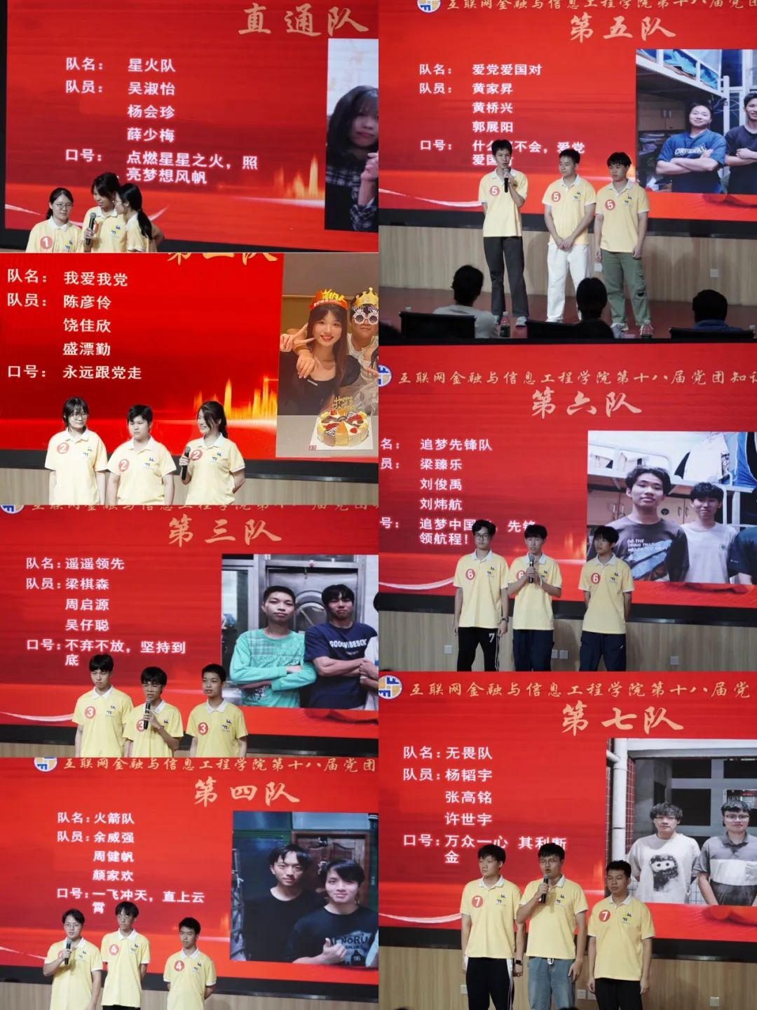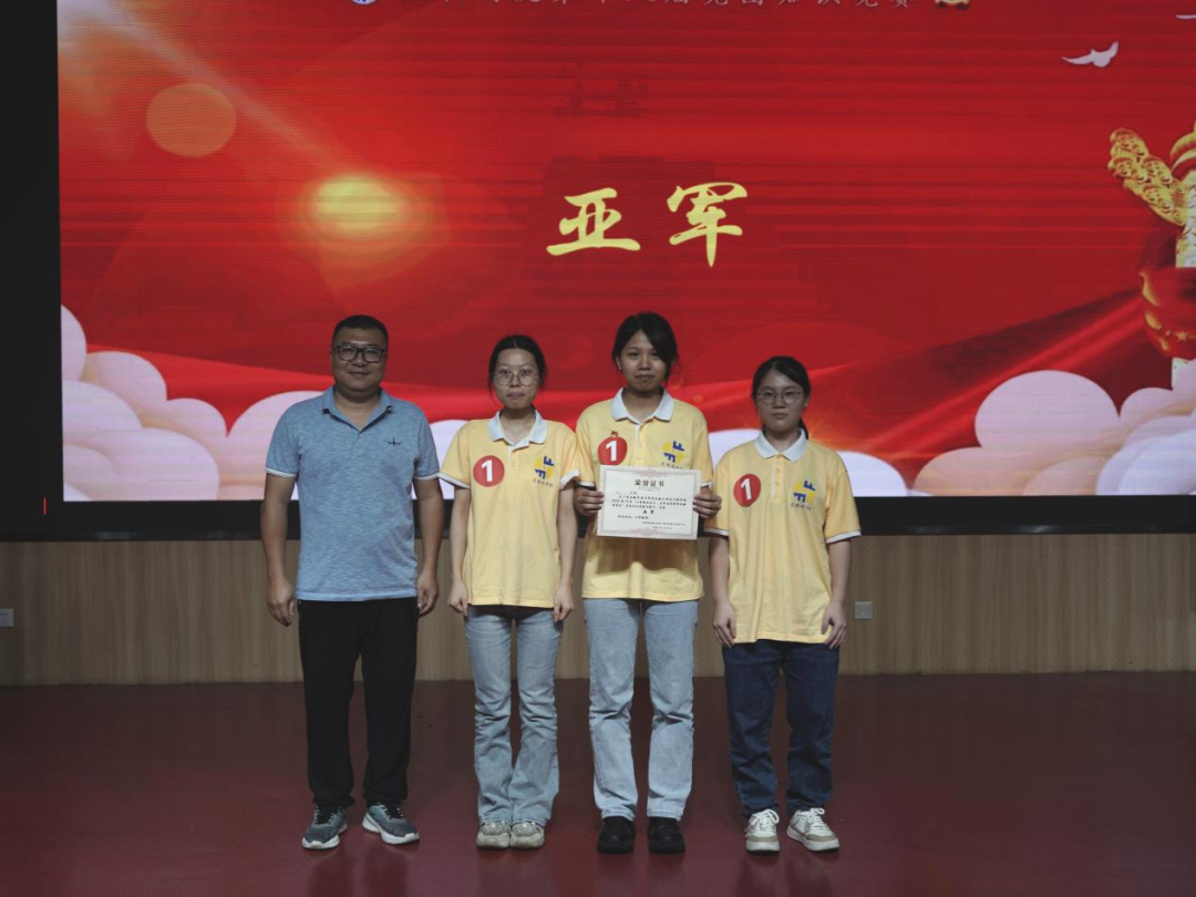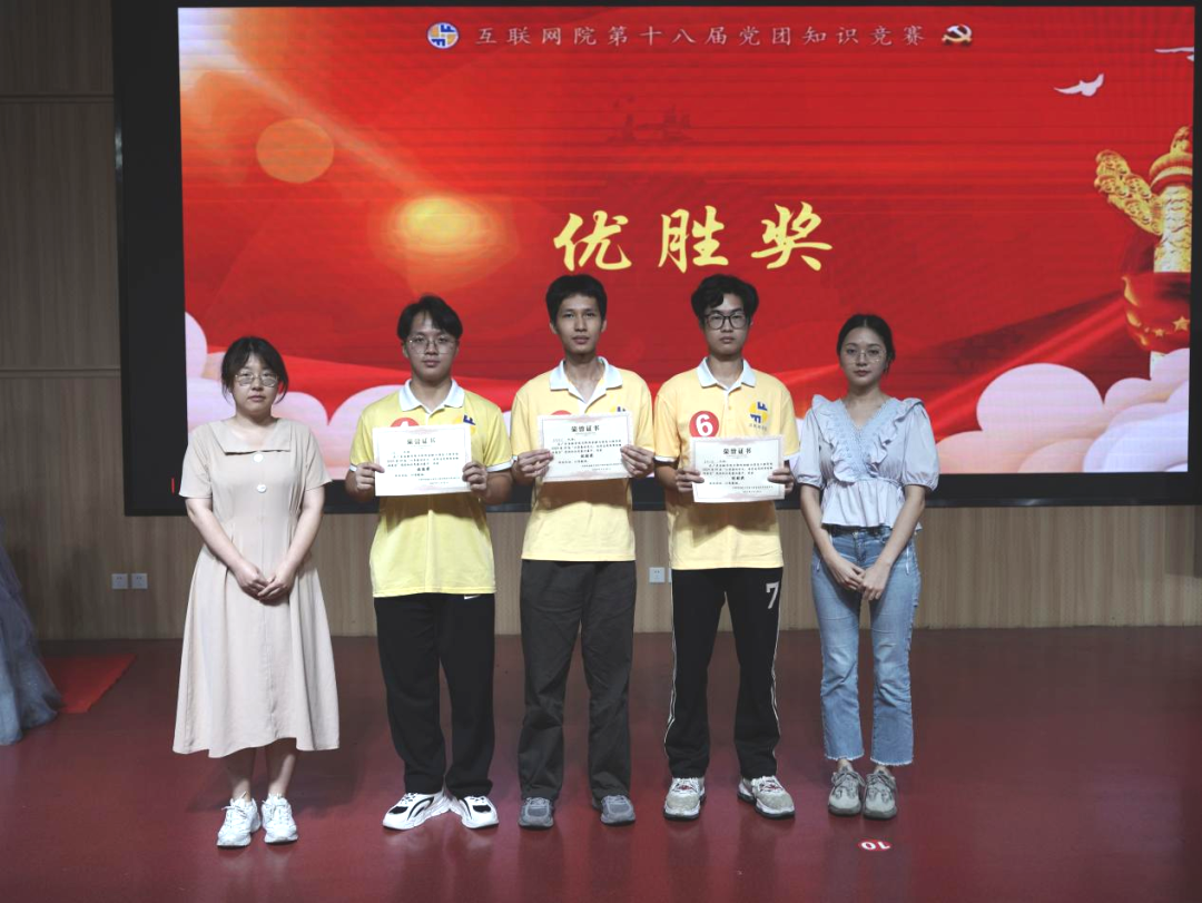 第五部分是激动人心的颁奖环节。本届党团知识竞赛冠军——遥遥领先队;亚军——星火队;季军——我爱我党队、无畏队;优胜奖——爱党爱国队、火箭队、追梦先锋队。(并列队伍按拼音排序)
