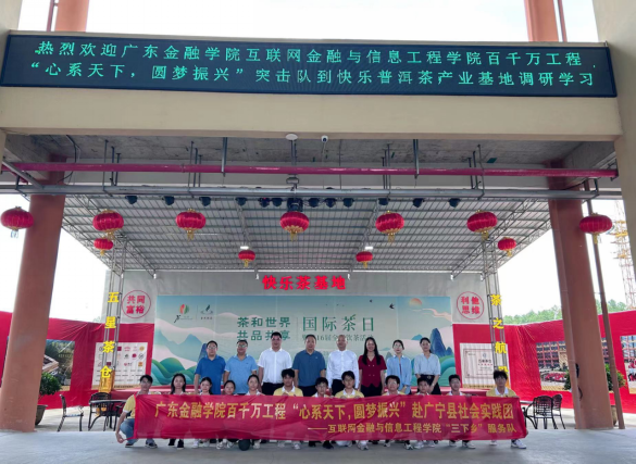 2024年7月15日上午,互联网学院党委书记胡小波、党委副书记蔡秋华带队前往广宁江屯镇,调研参观快乐普洱茶产业基地,同时看望百千万工程突击队“心系天下,圆梦振兴”队员们的工作情况。茶基地报以热烈的掌声诚挚欢迎各位领导、老师的到来。
